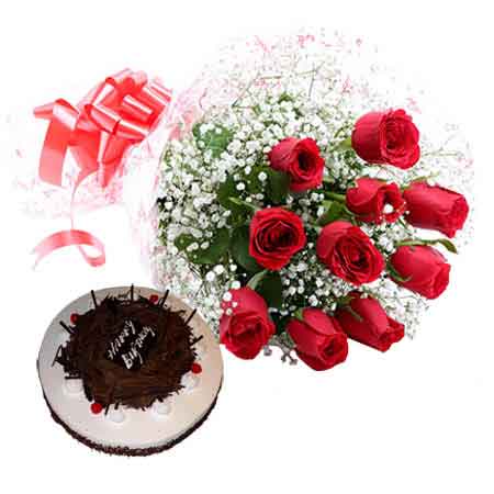 An incredibly beautiful gift set for all happy occasions! Send as gift or purchase it online to be gifted as heart winning gift, is set consists of fresh and beautiful 10 red roses and a super tasty half kg round shape black forest cake.