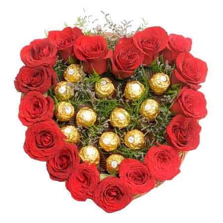 16 pieces ferrero rocher chocolates with 25 red roses heart shape basket arrangement