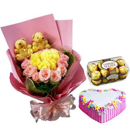 1 kg heart shape pineapple cake and (16 pieces ferrero rocher chocolates,7 yellow and 13 pink roses one sided pink paper packing bunch with 2 key ring size teddy on top)