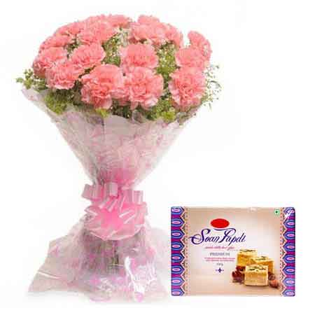 Celebrate any kind of joyous moments with this very beautiful bunch of 15 pink carnations and delicious half kg soanpapdi sweets. We always promise to serve you the best and provide you thebest class service. Midnight delivery of gifts is also available.