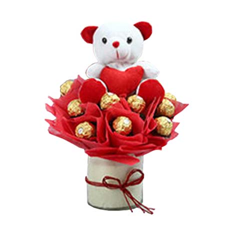 A gift for the princess without whom you are not complete, she can be your mother, daughter, wife or beloved. Just let her know she is extremely important by surprising her with a fluffy 6 inch teddy and with 16 pieces ferrerorocher chocolates nicely arranged in a prettylooking glass vase.