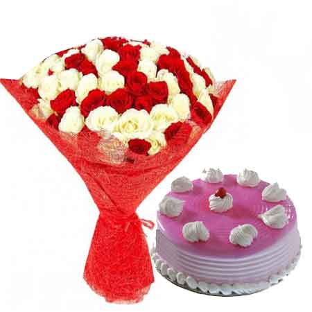 We present this very classic and romantic gift for all those who are in love. It is a beautiful combo of 36 red & white roses bunch tied in a red jute packing and a delicious half kg strawberry cake that is full of juicy strawberry crush, fresh cream and is coated with red glossy edible gel.