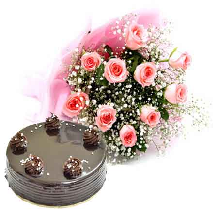 Affection and care can be best shown with flowers. Send this pretty bunch of 10 pink roses bunch arranged beautifully in cute pink cellophane packing. It comes with a combination of half kg chocolate truffle cake prepared with only the finest ingredients. Whether it is a celebration of an anniversary, wedding, Valentine’s Day or Birthday, this is a lovely gift for all occasions.
