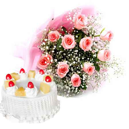 A special person is a gift of god. Let them know how special they are to you and send them this pleasing gift of 10 pink beautiful roses bunch and a half kg yummy round shape pineapple cake, stuffed with pineapple crushes and rich cream.